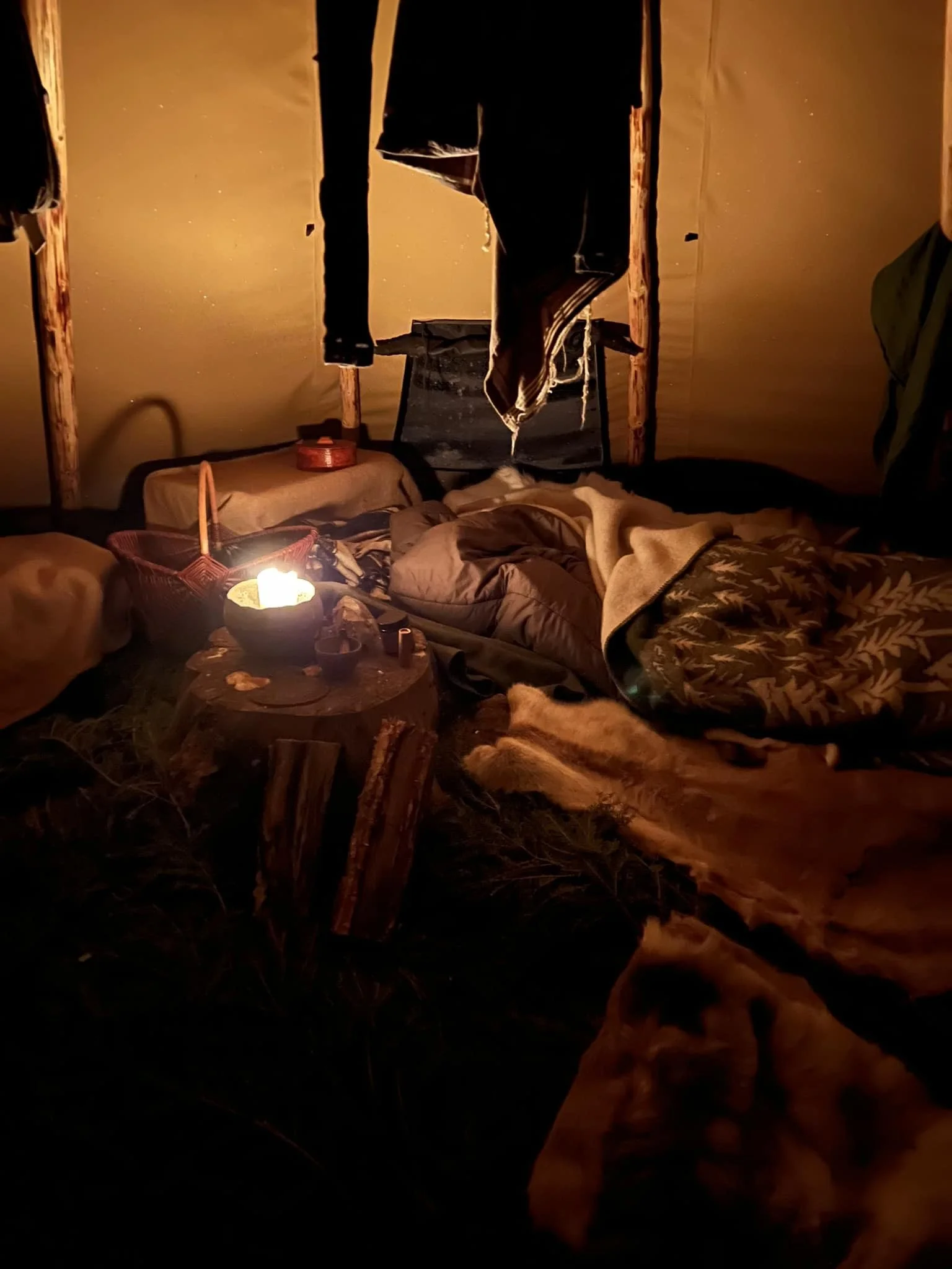 Om det är riktigt kallt med tjäle i marken är det viktigt att isolera så mycket som möjligt underifrån. Jag sover på två eller tre renfällar eller två fällar och ett ull tovat liggunderlag. För mig är naturmaterialen viktiga för jag vill behålla jordenergins läkande påverkan på kroppen under natten. Renfällar är några av de mest isolerande då varje hårstrå har en lufttunnel i mitten.