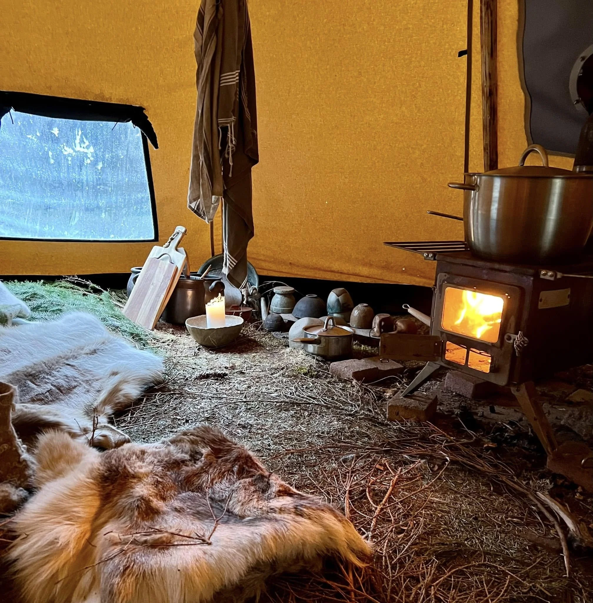 Utanför tältkåtan har det slutat regnsnöa och temperaturen sjunker. Hela förmiddagen har jag burit ved och eldat för att torka tältduken innan minusgraderna kommer. Kanske det viktigaste jag gör för att ta hand om mitt hem. Om kanvasen är blöt när allt fryser bildas små iskristaller inne i väven som ”spränger” tyget och gör det mer poröst och fuktgenomsläppligt. Det sliter helt enkelt mycket, mycket.